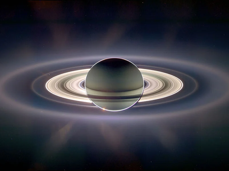 NASA calls In the Shadow of Saturn one of its finest images. It was captured by Cassini in 2006, as the spacecraft drifted in the planet&rsquos shadow for 12 hours. The glowing rim is caused by the eclipsed Sun, while the night side of Saturn is partly illuminated by reflected light from its own rings. &ldquoSaturn's rings light up so much that new rings were discovered, although they are hard to see in the above image,&rdquo said NASA. &ldquoVisible in spectacular detail, however, is Saturn's E ring, the ring created by the newly discovered ice-fountains of the moon Enceladus, and the outermost ring visible above.&rdquo P.S. Recognise that pale blue dot on the left, just above the main rings