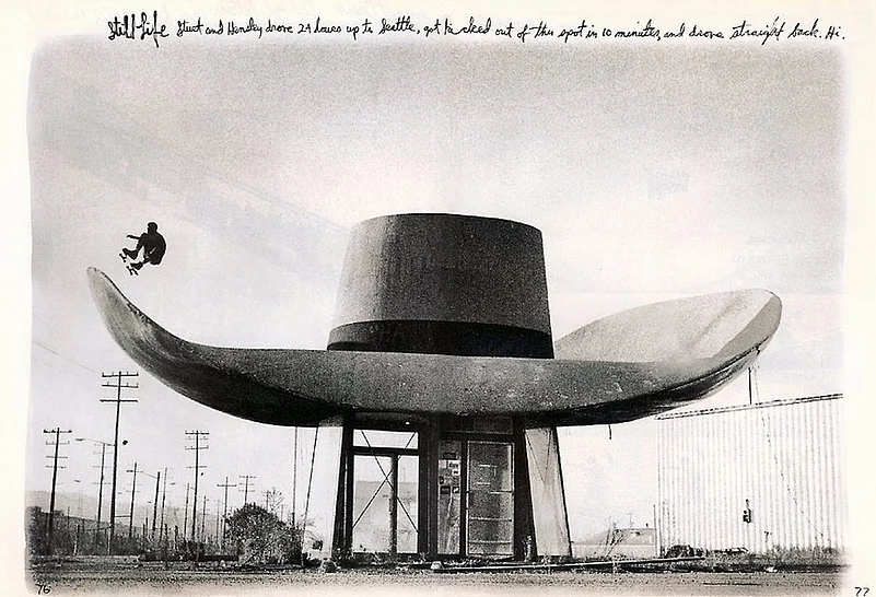 This giant cowboy hat now sits next to an equally large pair of boots in a Seattle park. Originally, though, it was built in the 1950s as part of a cowboy-themed gas station called &lsquoPremium Tex&rsquo. The hat&rsquos smoothly curved sides seem to be the perfect ramp for skateboarders, as skating legend Matt Hensley so deftly demonstrated in 1992. The iconic picture for Transworld Skateboarding was taken by Daniel Harold Stuart, whose note at the top adds a touch of mischief the duo drove 24 hours to Seattle, were kicked out of the spot in ten minutes, but promptly drove back and started again