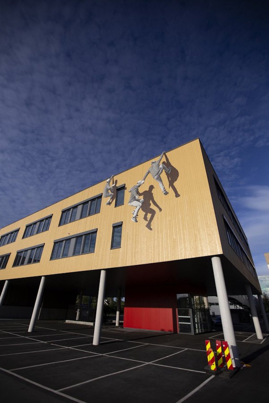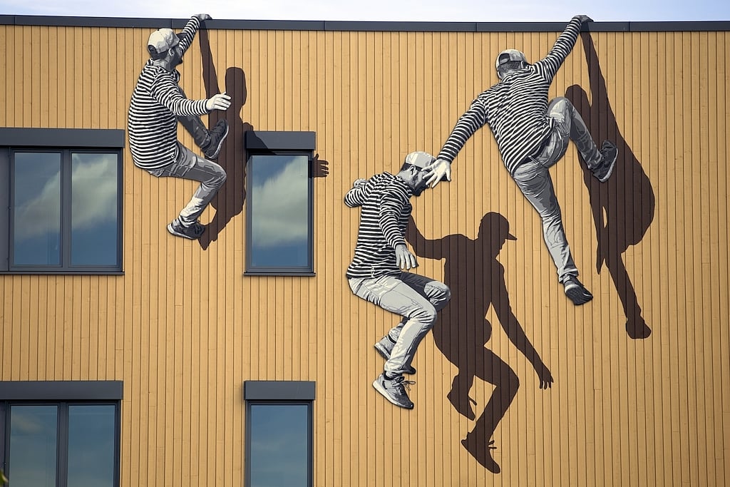 Anders Gjennestad is a stencil artist who leaves quite the impression. His street art pieces, scattered across Europe, are based on detailed photographs he has captured of human figures in urgent positions. The cutouts &mdash most prominently of people running, climbing, or parkour-ing away from a viewer &mdash have realistic shadows beneath them to give the feel of an optical illusion, and most of Anders&rsquo work is in black and white. Previously known as STRØK, the Berlin-based artist made this monochrome piece in his hometown of Arendal (yes, Frozen fans, it&rsquos a real place) and we can&rsquot really tell if he meant for the figures to be hoisting themselves up or jumping down.