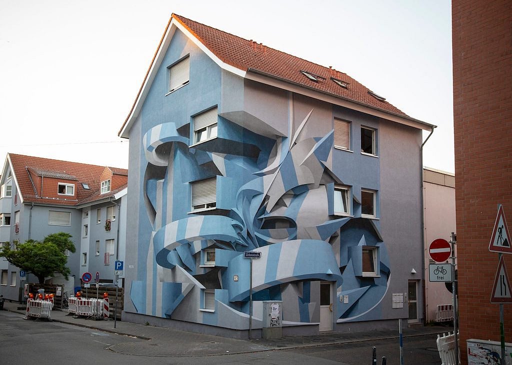 Peeta (or Manuel di Rita, when he doesn&rsquot have a spray can in hand) is a graffiti artist based out of Venice, Italy. He enjoys creating a visual rhythm using lettering and distorted architecture to play visual tricks on viewers. At the invite of the Stadt Wand Kunst festival, he visited Mannheim in the German state of Baden-Württemberg in 2019 with wife Maria Larissa Handiani to transform an inconspicuous house into a piece of show-stopping art. Influenced by sculpting, this large mural uses the trompe-l'&oeligil effect, with bulges, shadowy contours, swirling paths and rings seemingly popping out of a static grey wall.