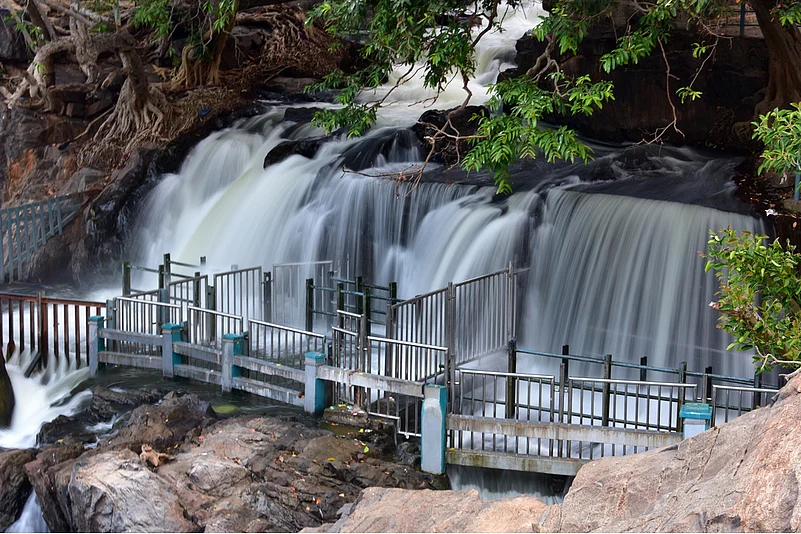 Located in Dharmapuri district of Tamil Nadu, Hogenakkal Falls is a sight to behold. Derived from the Kannada words &lsquohoge&rsquo which means smoke and &lsquokal&rsquo which means rock, the name perfectly describes the rushing waters which look like white smoke rising from the rocks. They are also known as the &lsquoNiagara Falls of India.&rsquo