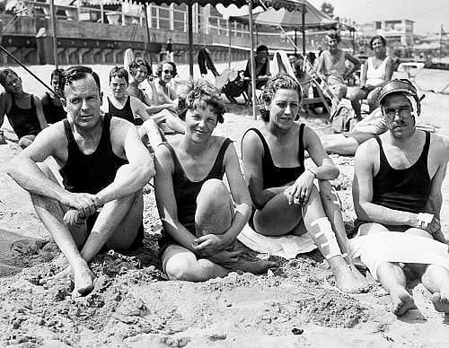 Amelia's husband, George Putnam, with aviatrix Amy Johnson-Mollison and her husband on a beach date circa 1933