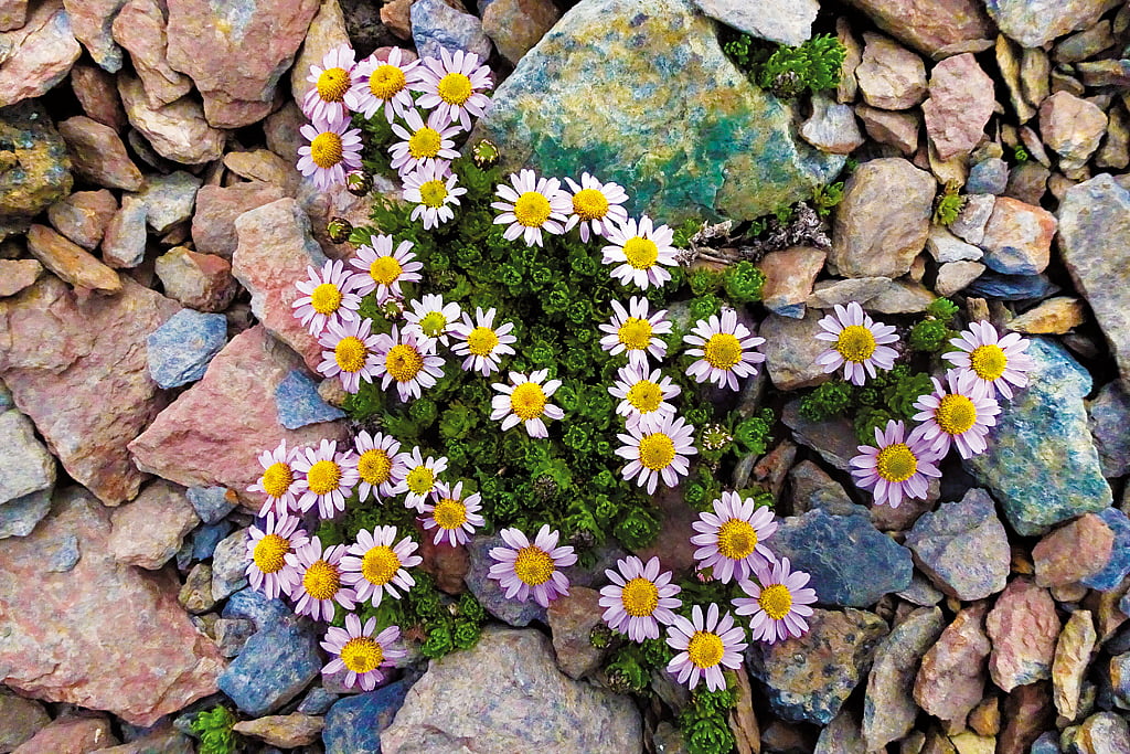 An incredible variety of wildflowers erupt effortlessly from under the glacier moraine. The entire valley is aglow in intense shades of blue, yellow, pink, white and violet. However, the heavy weight of this floral paradise, both in prevalence and allure, is the Mule&rsquos Ear Sunflower (Wyethia amplexicaulis). Brilliant yellow with frosty leaves, this perky miniature sunflower paints the meadow in a golden hue.