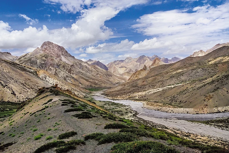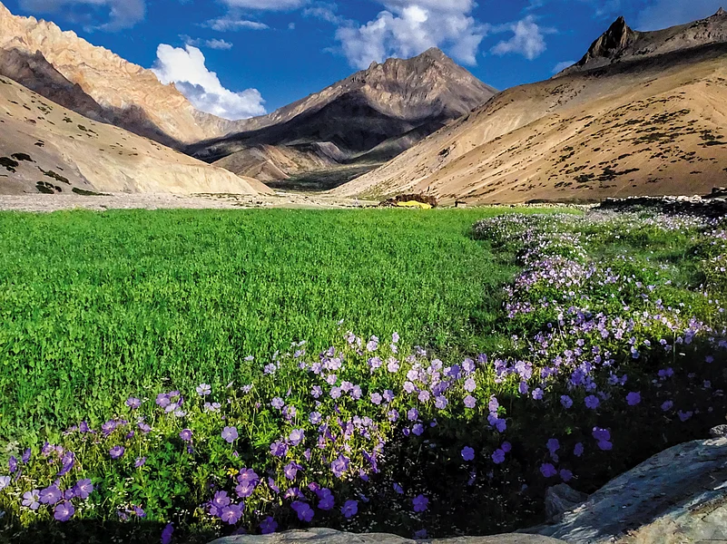 This is not what Ladakh is supposed to look like. It&rsquos a parched barren high-altitude desert, with a two tone landscape brown and grey. Forget Ladakh, nothing at 5,000 metres is supposed to look like this. But you can&rsquot argue with nature.