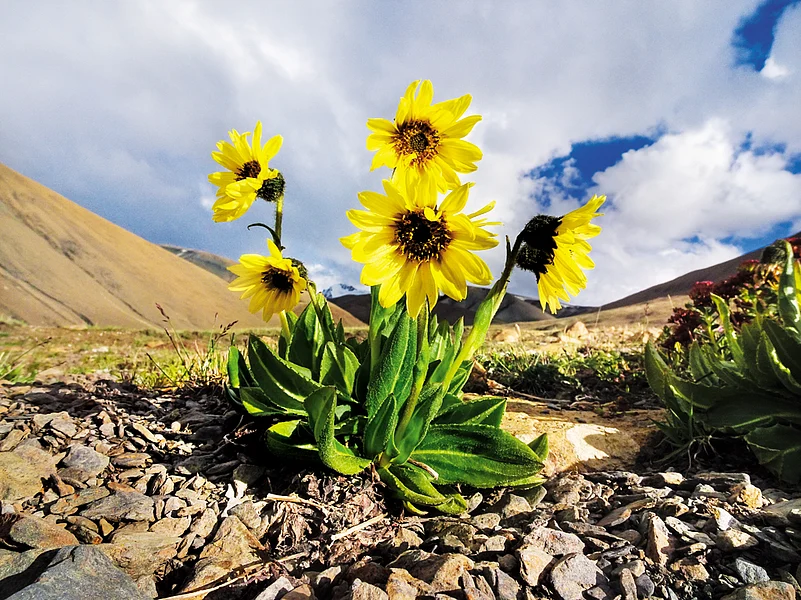 Rolling hills, like the soft rising mounts of a palm surround me from three sides. The fingers gently tapering downwards in offering, open up to a spread of jagged mountain peaks that stare back at eye level. Cradled in the central depression, lies a lavish flowering meadow, in full bloom. It is a riot of colours wherever I glance. A silent clear brook trickles downhill erupting and disappearing at will under the gravelly ground, it criss-crosses the entire meadow-like a well laid out irrigation system.