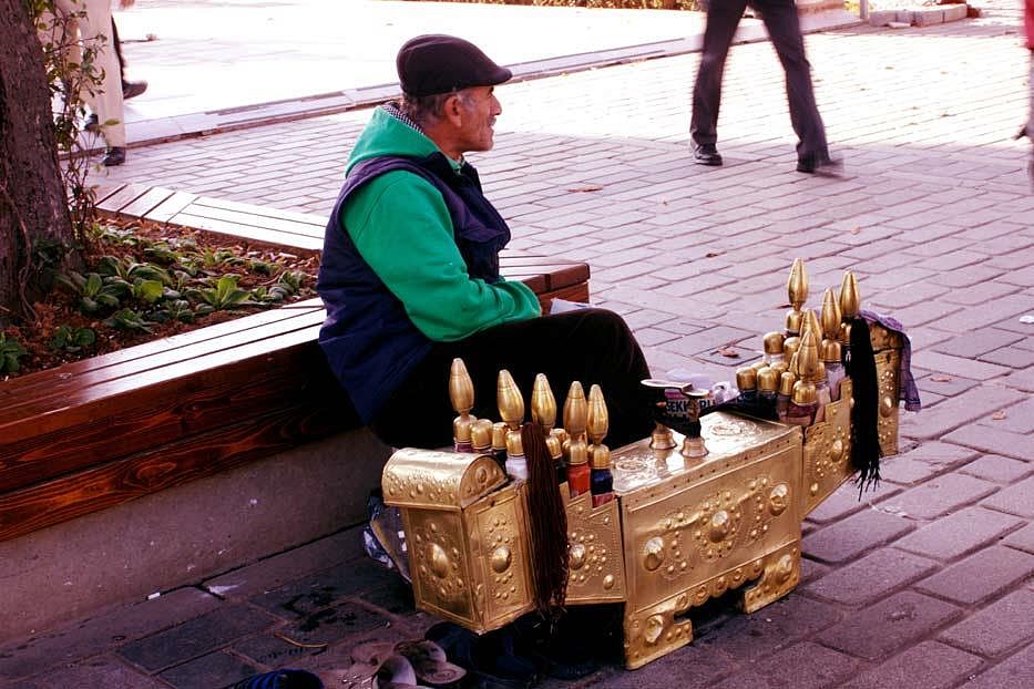 For Ottoman grandeur, one need not look beyond shoe-shiner's boxes, chic as the Taj on a full moon night compared to proletariat boxes. For a mere two euros, you can employ this dapper care-taking gentleman in newsboy cap to restore your travel-worn footw