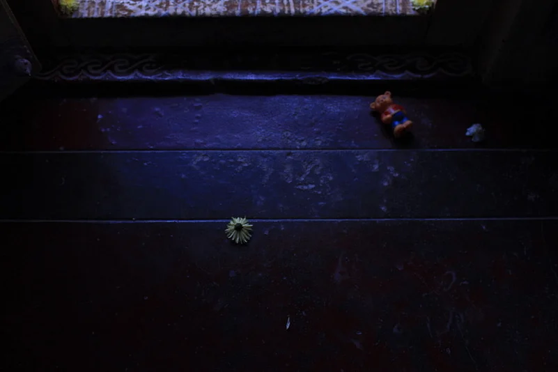 His workshop gives way, through a narrow path, to his house which is adorned by a rangoli in white (similar to the designs that can be spotted outside most houses in South India). His house is almost 200 years old. It was initially used as a place for auditions for performers at the Royal Palace. Later it was given to his family and they've been here since.