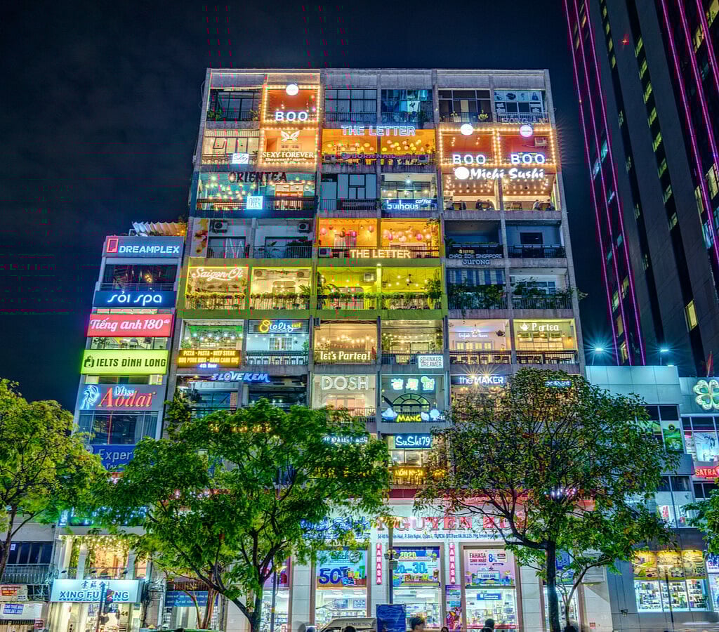 All the balconies of this 'Cafe Apartment' have a view of the Walking Street and the Saigon River. Walking Street is a buzzing place, always filled with people. Exploring the cafe-filled building at night makes it all the more appealing as it stands tall and luminous.