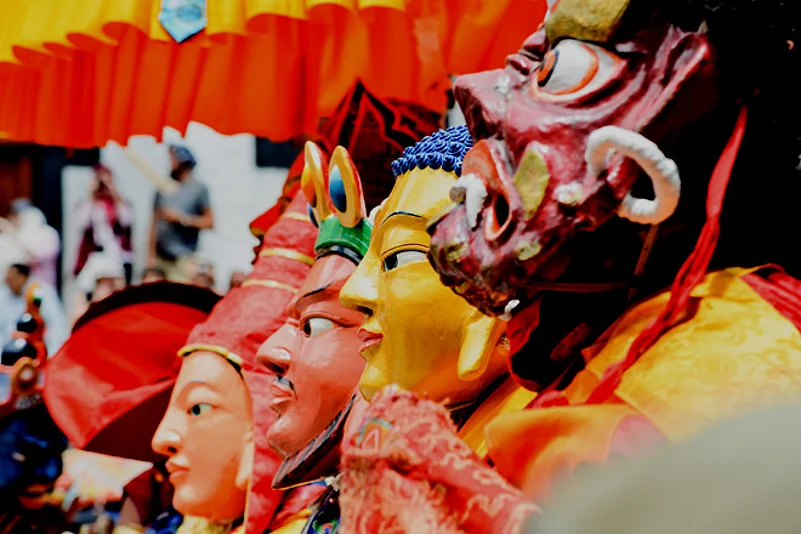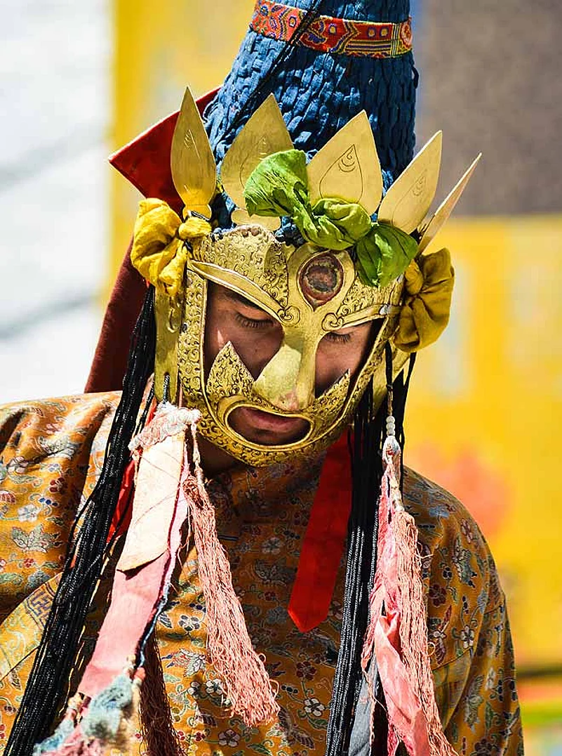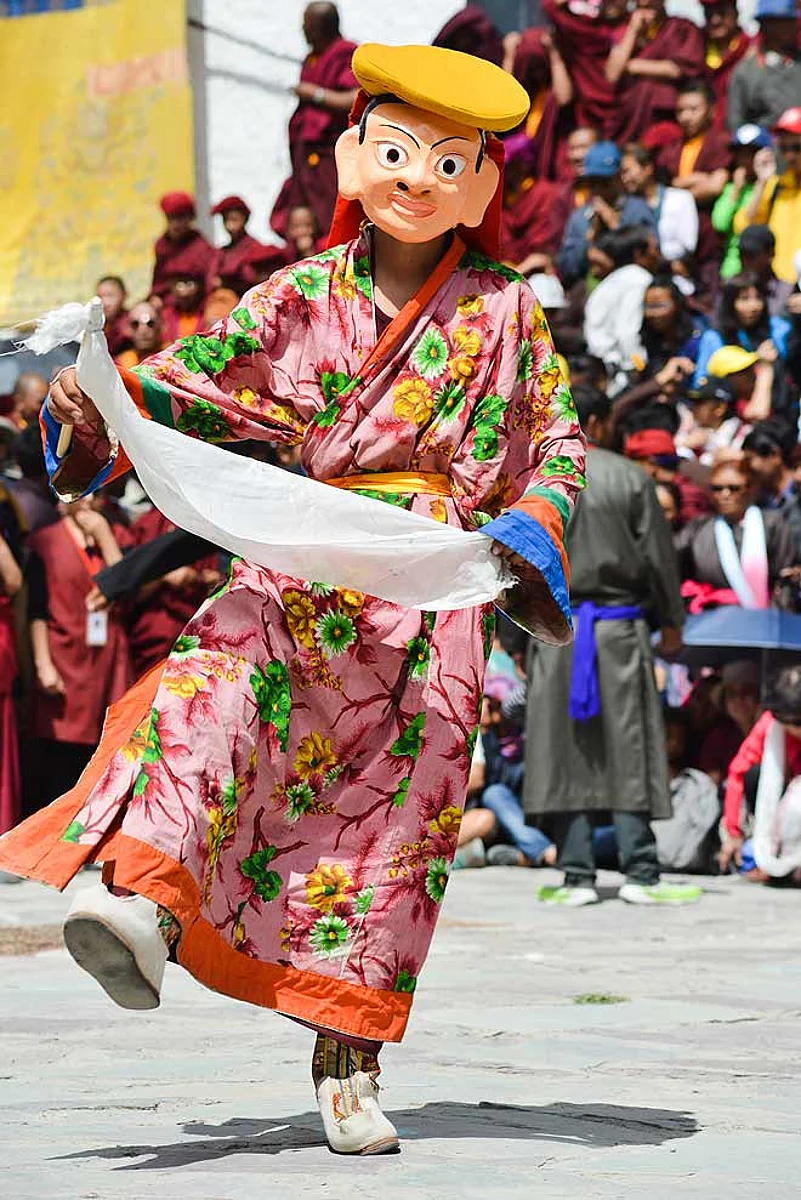 The performance, when it began, started with the famous Black-Hat dance by a group of monks in full tantric regalia. This performance recreates the dance that Padmasambhava had himself performed to subdue evil spirits and remove spiritual obstacles when the first ever monastery had been set up in Tibet at Samyas. This was followed by a dance of the divine dakinis, led by the supreme tantric goddess Vajrayogini, and finally the dance honouring Padmasambhava. During this, eight dancers wearing masks signifying eight stages from the spiritual career of Padmasambhava danced around the central flag pole and were then paid homage to by the monks and other dancers. This particular performance, an important one in the religious calendar of the Ladakhis, ended with each of the manifestations performing a solo dance. The huge thangka of Padmasambhava was then rolled up and the festivities were suspended for lunch. The rest of the performance resumed in the afternoon with ritual dances that celebrated the propagation of the Buddha Dharma and protected it from evil influences and blessed the land with prosperity.