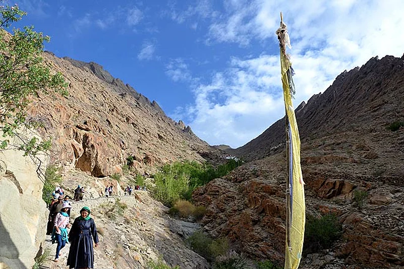 This year was special as it was the Monkey Year that comes about every 12 years. Accordingly, this years celebrations were even bigger, with the big draw being a gigantic three-storey silk thangka of Padmasambhava, made in 1750, that was unfurled at dawn. This followed an entire night of festivities and preparations as the monks got ready for the days main dance that paid homage to the eight manifestations of Padmasambhava. But before the performances began at 10 am, there was enough time for Ladakhis from Hemis village and other parts of the Indus Valley to make a quick pilgrimage, or kora to the cave hermitage of Kotsang, deep in the mountains behind the monastery. A tantric retreat for Drugpa monks of Hemis, some of whom spend as much as nine years practicing austerities and meditative sadhanas here, every year Ladakhis do this short trek to offer pujas at the cave shrine and be blessed by the resident monks of Kotsang.