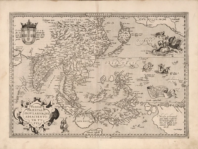 This is a first edition map of Southeast Asia from Theatrum Orbis Terrarum, the first modern world atlas. The cartographer, Ortelius, was an industry pioneer&mdasha star of Netherlands&rsquo Golden Age of cartography, he may have also been the first person to suggest the idea of continental drift. Spot &lsquoIndostan&rsquo above the Tropic of Cancer, and don&rsquot miss the &lsquosea monsters&rsquo in the Pacific Ocean, a mainstay on medieval maps. There&rsquos a particularly aggravated whale, a pair of vain mermaids, and a horned chimeric being.