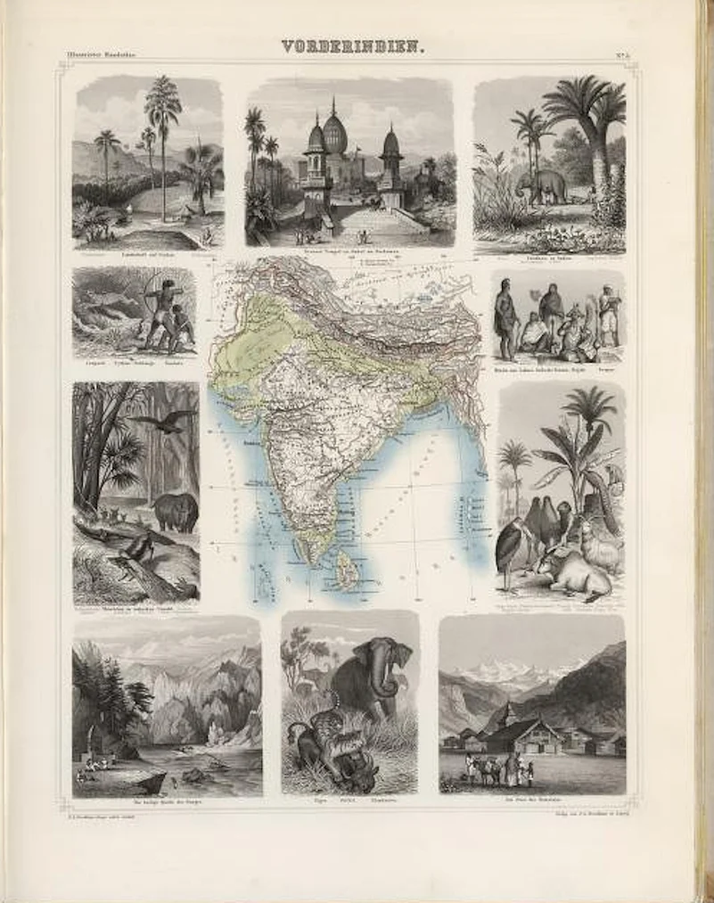 Ten steel-engraved illustrations of Indian geography, architecture, culture, and wildlife frame this 19th century map of India&mdashI particularly like the ones showing a Santhal hunting scene, and the Himalayan foothills. Each of these high-contrast sketches is incredibly detailed with hachures and cross-hatches, and probably worthy of their own framed prints. Vorderindien is part of a 22-map atlas that&rsquos still quite sought after. An 1863 edition was reprinted as recently as 2005.