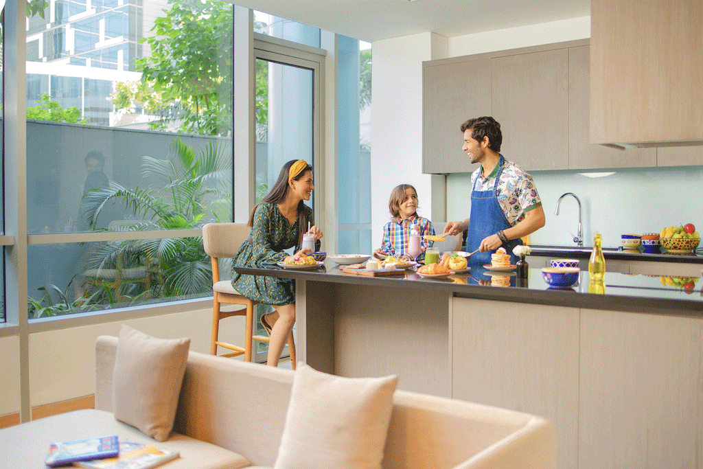 Enjoy the privileges of a starry hotel at home, where every request can be fulfilled with one call to the 24-hour concierge service. Contract terms are flexible, so no matter how long or short your stay is, you can enjoy amenities like an all-day fitness centre, the Andaz Spa, currency exchange, paid-out requests, wheelchair-on-call and a dedicated swimming pool. Abhor the toil of haggling at markets There&rsquos a well-priced grocery and market list right in your room, so you can slide into your apartment&rsquos sleek kitchen with abandon and cook up a storm. And did we mention that the hotel complex is also pet-friendly