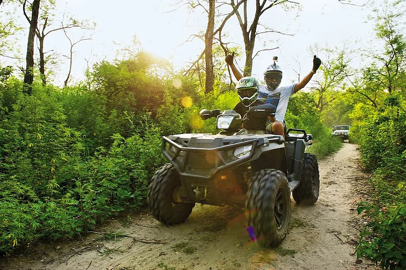 That evening, we cycled deeper into the wilderness, finally ending up in a deep gorge where a broad, flat stream murmured quietly by. The quad bikers were having a field day doing donuts and disturbing the shallow waters by riding up and down the stream. Why do we get so much joy from splashing water (Not complaining, just wondering.) We, the cyclists, decided to give our protesting legs a rest, and headed back in a tractor trolley, pulled by a half-century-old Tafe tractor made in Yugoslavia. If Punjab is beautiful by day and by night, it&rsquos positively magical at the hour of twilight. As the evening sky took on a deeper golden hue, the air was filled with bird call. We trundled along, startling a nilgai once, which rapidly disappeared into the surrounding foliage. At one point, the tractor got stuck in the sand, which provided some mild frisson, but we soon nudged it into action and were on our way. We ran into two guys in an Isuzu pickup, whom Harkirat knew. They had stopped in the middle of nowhere to have a couple of cool beers and contemplate the Punjabi countryside in all its tremulous beauty. One of them looked like he mostly lived abroad. A typical tableau of Punjab if ever there was one.