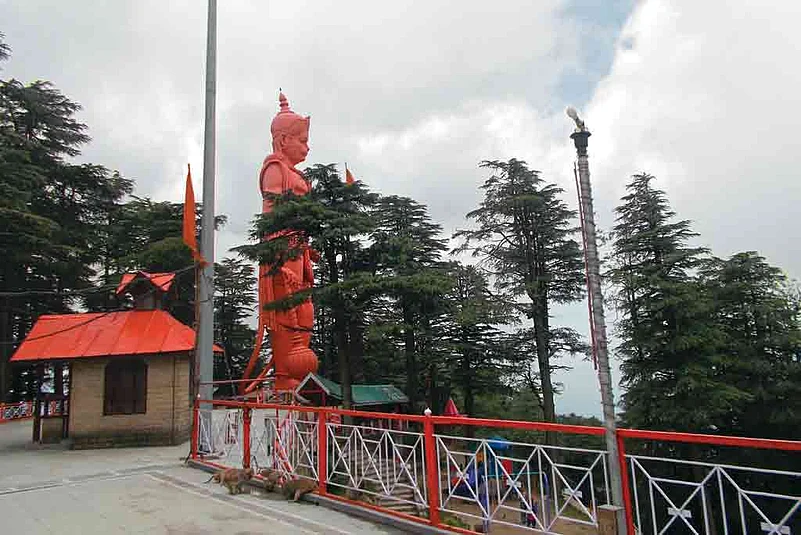 Jakhoo Hill (7,500ft), towering over the ridge, is Shimlas highest point. It is crowned by the famous Jakhoo Hanuman temple, with an extravagantly gigantic statue of the monkey god. Sunset views here are especially magnificent during the monsoons. En route to the temple is Rothney Castle, residence of AO Hume, believed to be the founder of the Indian National Congress. While the route from the ridge is the standard one, a track variation may be made from Sanjauli to pass through a thick wood of oak, rhododendron and cedar.