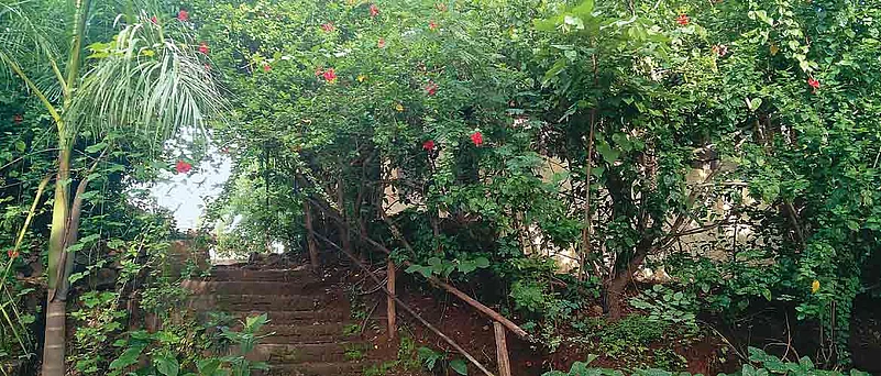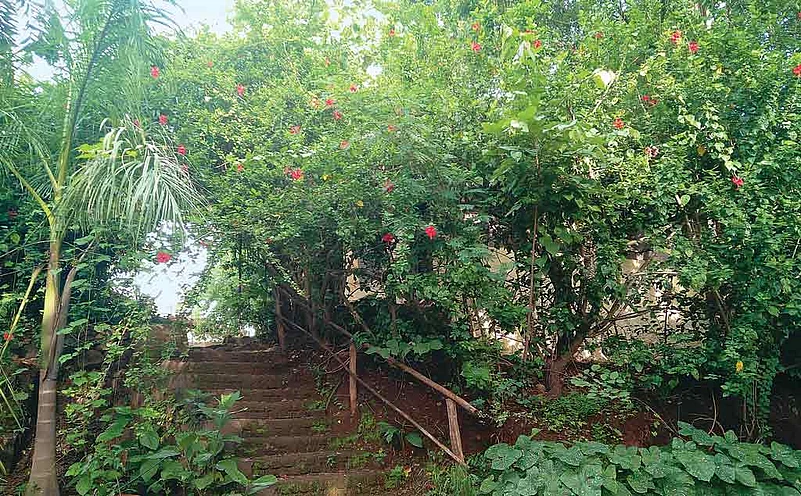 A tunnel of green welcomes you as you enter the gates of Hideout Farm. My driver looked around suspiciously, not at all convinced that this was my intended destination. The end of the driveway opened out into a large parking space, with steps leading up to the residential area. Much to my delight three desi dogs greeted me with loud barks as I ascended the short flight of stairs. Welcome to our beautiful home they seemed to say and I couldnt agree more about the beautiful part. Everywhere I looked I saw a web of trees, flowers and creepers it was as though Id stepped into a rainforest.