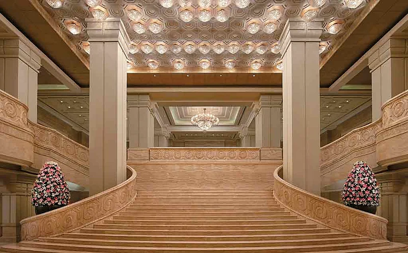 As we went around the building, Mr Ramamoorthy explained that it wasnt just its name that was inspired by the imperial Cholas, but its architecture as well. One of the longest ruling dynasties of south India, the Cholas were great patrons of the art and were responsible for sculpting some of the most incredible temples that are still extant. Just like south Indian temples built in the Dravidian architectural style, the hotel has four entrances named Vallavan (north), Sembiyan (east), Killi (south) and Chola (west). The central structure of the complex is domed. Though the interiors are modern, there are soft flower motifs sculpted on the walls, ceilings and pillars. These are inspired by the Brihadeeswara Temple of Thanjavur and were meticulously etched out by 4,000 artisans who came from nearby Mamallapuram. One of the most remarkable features of the building is the grand, sweeping staircase near the main lobby of the hotel, which boasts an elaborate wooden sculpture of two horse-drawn carriages on the wall. And it becomes even more remarkable at 6.00pm in the evenings every day when a short Bharatnatyam performance takes place here. Dont miss it all guests are welcome to attend