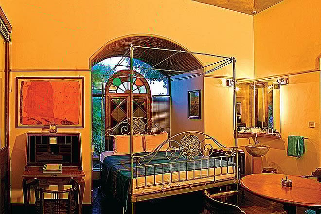 This last is really the signature that owner Dimitry Klein has scrawled across the property. His previous avatar as a Parisian ad agency owner and his eye for design is obvious all over. Just the use of colour alone is a delight, and the way his designers play with the rooms. In the Tower, the bathroom is filled with light and air. I love the way the bold red of the oxide floor is picked up by the red of the washbasin. And the way the dramatic view is allowed to be the design of the room &mdash no distracting pictures on the wall or other décor.