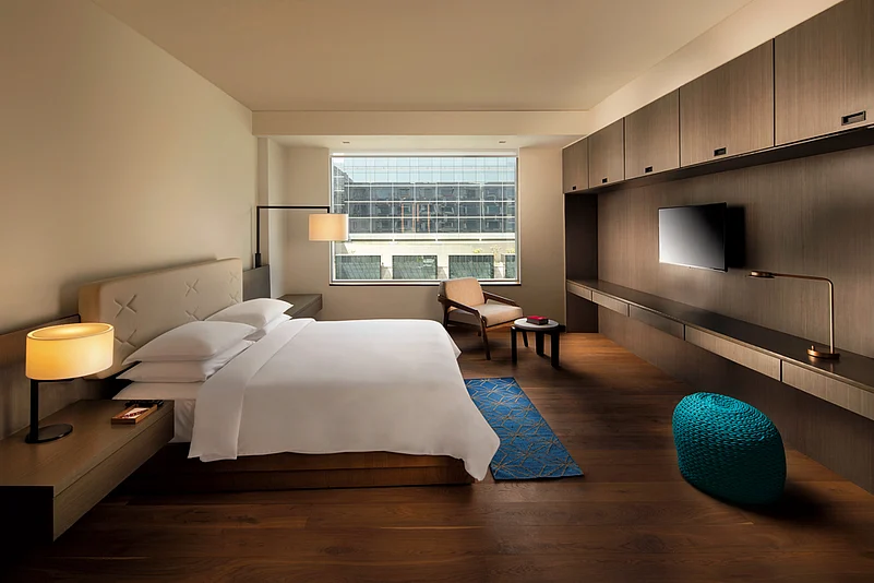 Accommodation options for guests interested in the Residences include one-, two-, and three-bedroom apartments, as well as swank duplex townhouses, which come with two or three bedrooms. The Residences have their own private pool, although you&rsquore free to use the bigger hotel pool if you like. One of the USPs Andaz is betting big on is its location, midway between Delhi and Gurugram, and therefore able to cater to long-stay executives working in either city. The other is security.