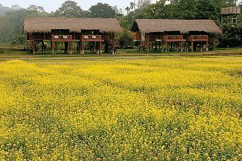 How was this so? The Phookan family, which owns the lodge along with the Brocks of England, happened to own land very close to the resort, and chose to develop it for tourism back in the 1970s. Situated about 100m from the main road, it is completely sheltered from the hum and bustle of the highway. From the one-storeyed front office, one walks across a campfire site, and then a few steps down into the residential area of the lodge. A dozen cottages on stilts - eight standalone and four semi-detached - are arranged along three sides of the resort's perimeter.