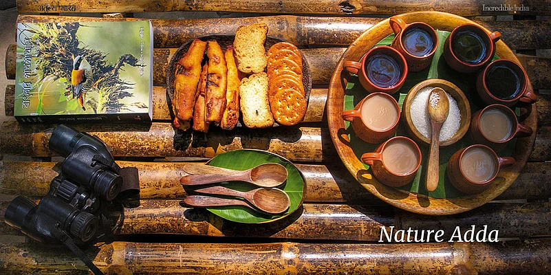 The Ghosh family home had been damaged to a large extent by a flood several years ago. However, Shantanu and his team decided to salvage what was left and add to it. The double-storeyed building consisted of two rooms on the first floor. One of the rooms was the spacious main bedroom, fronted by a verandah, and with the typical old style red oxide floor. It was part of the original building that was devastated by the flood. The vintage furniture, including a high four-poster bed, harked back to the olden times. A passage led to the second room which was styled like a mud hut with a thatched roof and eco-friendly décor, including bamboo furniture, hardened green coconuts used as bulb holders, etc. The sitting area attached to the mud hut overlooked the greenery below. It was here that we settled down for tea and Bengal&rsquos favourite snack, muri and tele-bhaja (puffed rice and vegetable fritters).