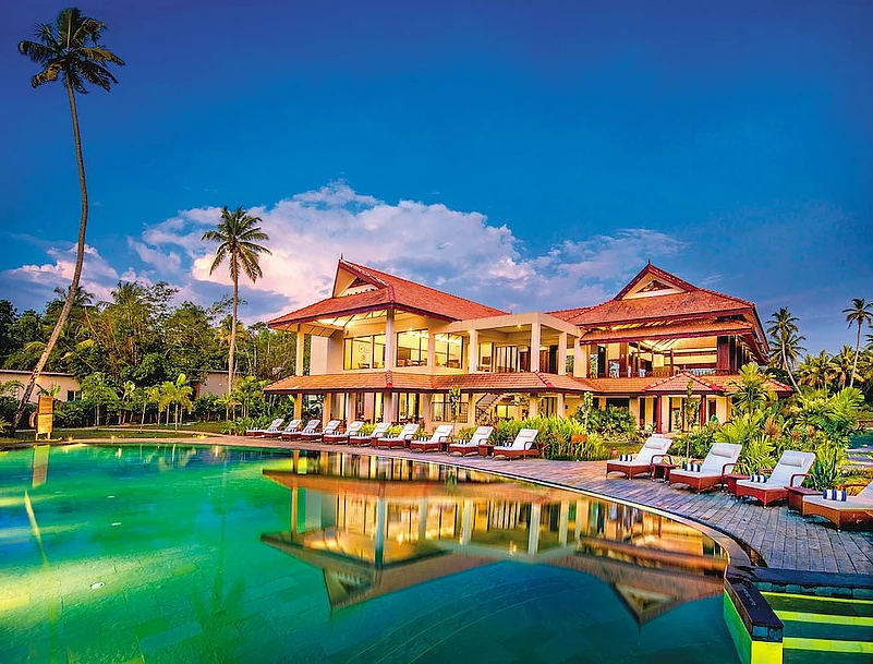 The plush villas offer stunning vistas of the backwaters with amenities such as open-air baths and private balconies.