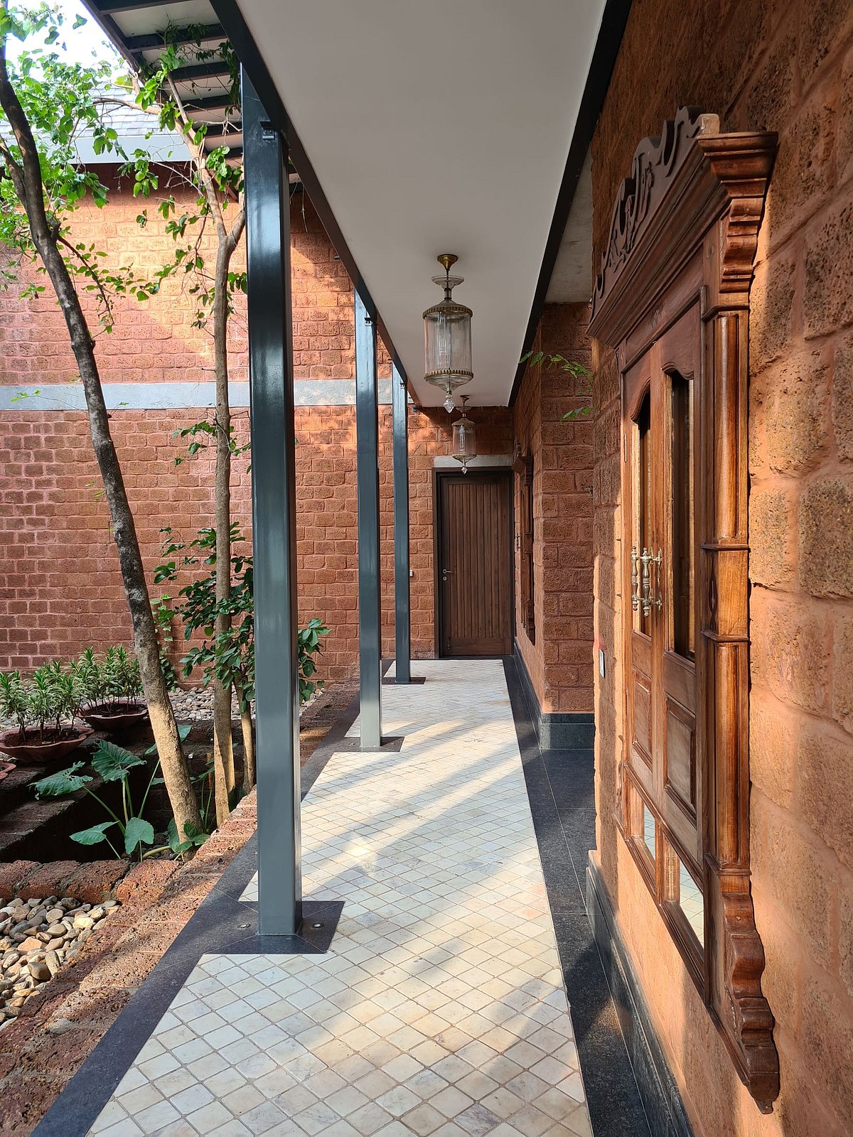 At sunset the villa was a bright pink, the light bounced off its walls and pillars and formed intricate patterns of geometric light. The backwaters and the infinity pool overlooking it, was resplendent with the mellow light. When the sunlight disappeared, and the lights came on, the villa looked different. It was impressive with a mix of industrial and Moroccan lighting. An extensive chandelier of brass lights hung above the central seating area and one could spend hours working or just relaxing there. So much of the villa itself is an inevitable play of light.