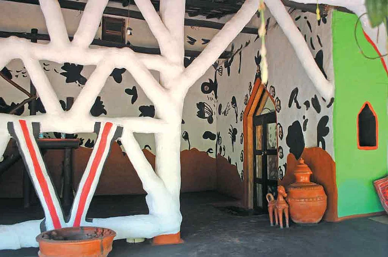 Set amongst towering eucalyptus trees, the verdant property exudes rustic charm &ndash the cottages and the dining area are painted a white and earthy brown. While the two cottages here (each has three rooms) may look simple on the outside, their interiors are adorned with interesting tribal paintings and bell metal art. The colour of the walls and the upholstery inside beautifully complement each other. Each room comes equipped with a large, tastefully designed bathroom, the walls of which are decorated with shells in stunning patterns. The shower area is filled with pebbles, giving it a bucolic but luxurious appearance. Instead of using shower curtains, the management had hung blue cotton saris, the kind that are donned by local women, which was a lovely touch