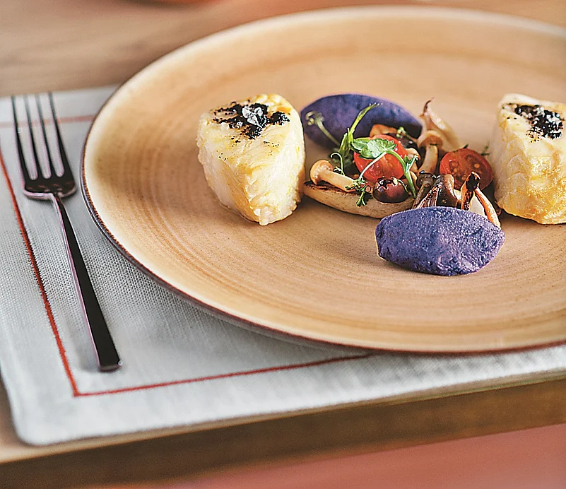 Inspired from sun rays cast over the Southern Ocean &mdash with a purple hue making the marine life look white &mdash there is white butter poached sea base, accompanied by the purple potato, served on a bed of wild mushrooms resembling the ocean floor.