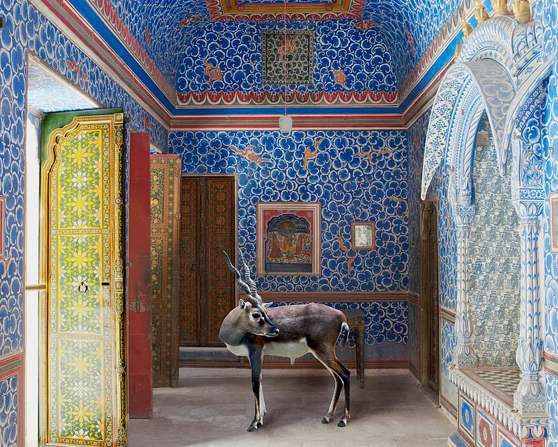 I am using the interiors because I found out that there were not a lot of images of interiors. I wanted to do something to celebrate the visual culture of India. I studied miniature paintings and used those animals in my photographs.