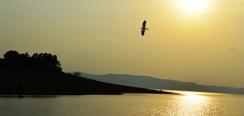 Towards twilight, when the birds were on their way home, Hirakud was a sea of unlimited water with gently swaying blue waves. The water had been released after morning. The water from the river had come through the sluice gate and filled the heart of the biggest dam in the country. The birds then became directionless. Their familiar villages and trees were all under water. Their distress calls sounded like wailing. They flailed their wings and were trying to look for those branches where they used to sit after a bout of flying. Their resting places had all gone deep under water. So the birds flew in circles over the water. Who could say on which tree lay their unhatched eggs, and the fledglings that had not yet learnt to fly