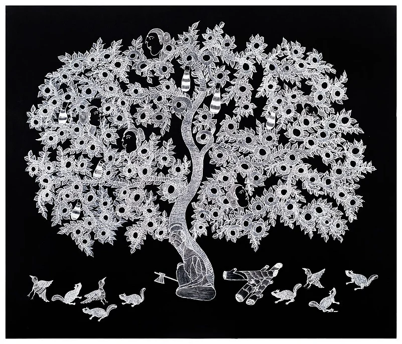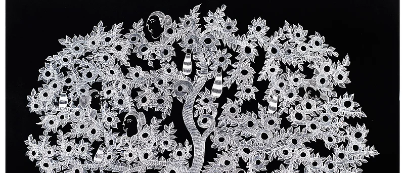 Mayank Shyam and Japani Shyam are children of the famous gond artist Jangarh Singh Shyam. Both their styles are similar in more ways than distinct. This brother-sister duo knows their trees. Japanis paintings give you a two dimensional view of the complex paths branches and leaves can conjure in monochrome. In one of her painting, women peek out of the dense cover of the trees. Squirrels and birds on the other hand rest on the ground, looking at their home under human invasion. Mayank props his foliage with birds too. They are the only coloured elements in his otherwise black and while ensemble, surrounded by water breeding coloured fish. In our village it is believed that life started from water, Mayank says.