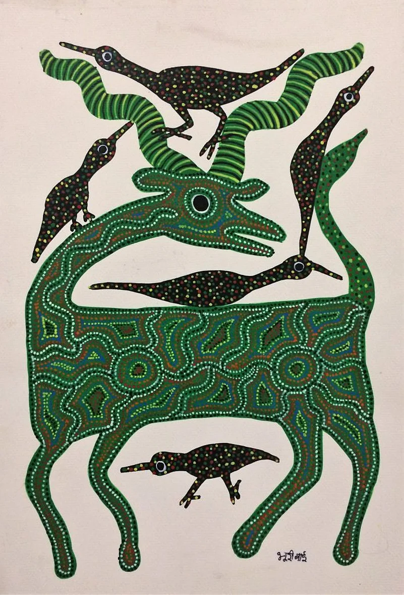 Bhuri Baiwas of Pitol was introduced to paper, paints and canvas for the first time by J.Swaminathan at Bharat Bhawan, Bhopal. She welcomed this easy availability of means as she could skip the struggle of extracting paints from plants and clay. She first painted her ancestral horse with poster colours Her Bhil paintings display a synthesis of plants and animals, in their natural habitat. They meet the eye with the striking use of primary colours, but theres more that she tries to say in her composition. Horns of a deer rise to the top to the painting. Birds rest on the branched out horns. The use of green for these branched out horns gives the impression of leaves growing out of them. Bhuri Bai now works as an artist in the Adivasi Lok Kala Academy in Bhopal.