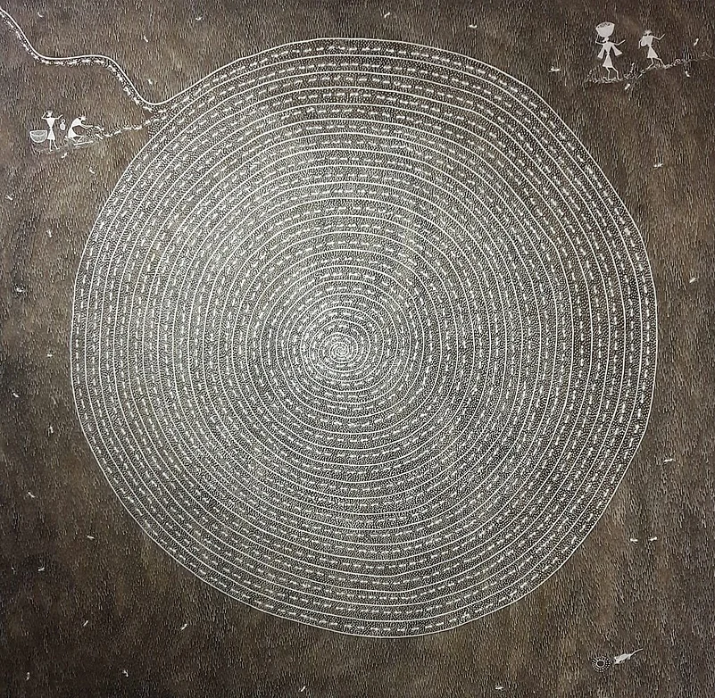 Sadashiv Soma Mashe hails from coastal village of Ganjad, Maharashtra and paints with acrylic and cow dung on raw canvas. His paintings abide by classic warli style. Geometric figurines dominate a landscape that portrays community culture. Two of his paintings depict giant fish nets and fishermen propped on their top, holding them together. Creatures trapped in the net represent the entire ecosystem of the ocean and make for most of the painting as well. He seems to have delved into the lives of those who thrive along the coast. He does so by giving most of the prominence to the fodder of this community- marine life. Theres also a meditative painting that shows hundreds of ants descending into the epicenter of a gigantic spiral. While the spiral, home of the ants occupies most of the space on the canvas- there are miniature humans, rats and grass around it.
