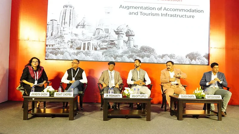 One of the panels was on the augmentation of accommodation and tourism infrastructure, moderated by Anindita Ghosh, Editor of Outlook Traveller. On the panel were renowned personalities from the travel and hospitality sector, including Rohit Chopra, Director of India & South Asia ACCOR Group, Arun Chittilappilly, MD of Wonderla Holidays, JK Mohanty, co-Chairman FICCI Tourism Committee, and Santosh Kumar from Booking.com, along with Souvagya Mohapatra of Atmosphere Hotels & Resorts.