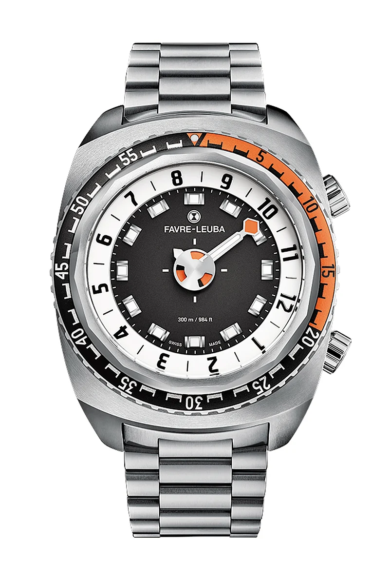 Focus is critical when diving, and Favre-Leuba&rsquos newest watch is a great supporting act. Noting the number of minutes is important when underwater, and so the Raider Harpoon has exchanged the hour hand for a patented co-rotating indicator. The minute hand is aided by a bezel with a 20-minute scale to remind of decompression. Water resistant up to 300 metres, it is kitted out with a helium valve for pressure balance and a dial with luminous index marks. (From INR 2,90,373 favre-leuba.com)