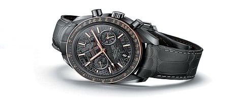 Imagine wearing a piece of extraterrestrial rock, which also happens to show the time. Omegas new offering has its dial made from a solid piece of meteorite rock. Specifically, this ones from the prehistoric Gibeon meteorite that fell in Namibia. It also boasts of having a Widmansttten pattern, which a scientist used to describe the pattern found on all such stones. 6,98,300 omegawatches.com